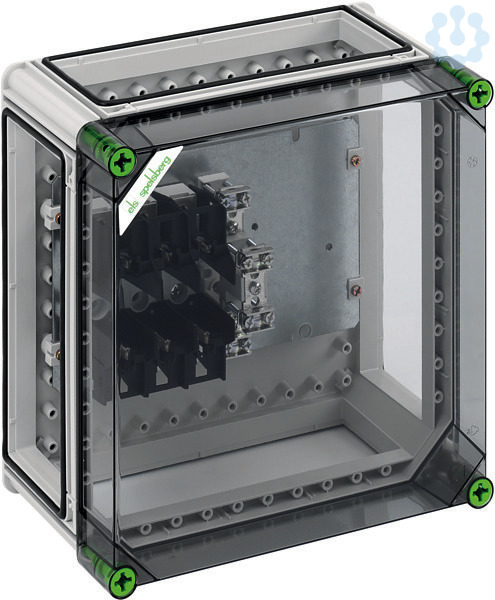 NH-Sicherungsgehäuse, Industrie Qualität, 1 x NH 00-Sicherungsunterteil, Schellenanschluss 1,5-70qmm, PE/N-Klemme 2 x 50qmm, montiert auf Montageplatte, 3 x Gehäuseverbinder (GGV), mit transparentem Deckel