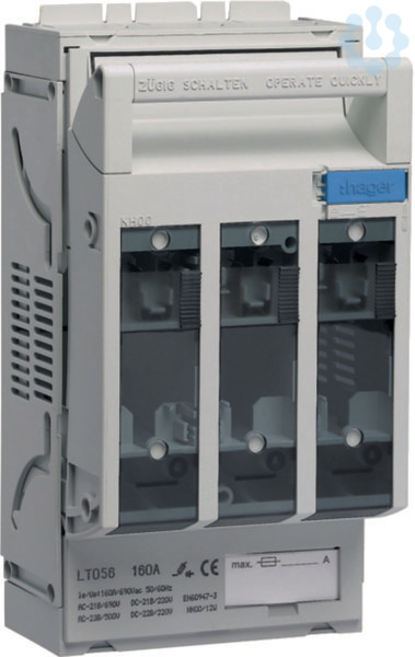 Sicherungslasttrennschalter LT NH00/60mm, 160A, Rahmenklemme 95mm². NH00-Sicherungslasttrennschalter für Sammelschienenmontage Abstand 60mm nach DIN EN 60947-3 (VDE 0660-107) und geeignet für NH-Sicherungseinsätze nach DIN 43620/1. Bestehend aus 3-poligem Schalterunterteil und plombierbarem Griffeinsatz, Berührungsschutz am Griff, mit verschiebbarem Klarsichtfenster zur Spannungsprüfung, allpolig schaltend, zur Montage auf CU-Sammelschiene Abstand 60mm, Abgang oben bzw. unten, ohne zusätzliche Blende.