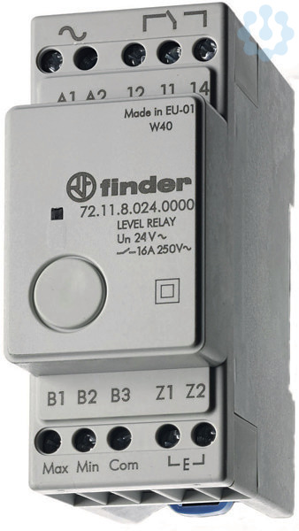 Niveauüberwachung für DIN-Schiene, 1 Wechsler für 16 A, Kontaktmaterial: AgCdO, Automatenbauform: 35 mm breit, Überwachung von bis zu 3 Sensoren, Empfindlichkeit 150 kOhm, Verzögerungszeit 1 Sekunde, Funktion Füll- oder Entleerungsüberwachung wählbar, LED-Statusanzeige, Versorgungsspannung 24 V AC, Relaisschutzart: IP 20.