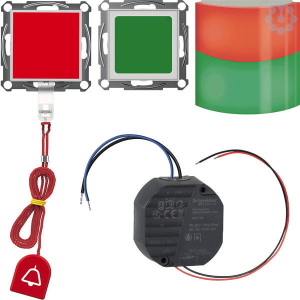 Notrufset mit ZSLeuchte, Zugtast. Abstellt + UP-Netzgerät SIGMA care ELSO Joy. Das Notrufset beinhaltet alle Komponenten, um einen Raum, wie z. B. ein Behindertengerechtes WC, mit einer Rufanlage nach DIN VDE0834 auszustatten. Mit UP Netzgerät für die Montage in einer UP Dose Hutschiene. Set besteht aus: Zimmermodul mit Signalleuchte: Das Zimmermodul für einfache Rufanlagen gemäß. DIN VDE 0834 dient zur Anzeige einer Rufauslösung und zur Anzeige einer Anwesenheit, sowie der Rufnachsendung durch eine optische und akustische Signalisierung. Durch die Einbindung in den Systembus ist ein Aufbau kleiner Anlagen aus. bis zu 10 Zimmermodulen und zentralen Anzeigeeinheiten realisierbar. Mit zwei Relais, die einen Ruf oder eine Störung an externe Systeme weiterleiten. Zugruftaster: Der Zugruftaster dient zum Auslösen eines Rufes, der optisch und akustisch. an einem sichtbar montierten Zimmermodul außerhalb des Raumes angezeigt wird. Rote Zugschnur in 3 m Länge und rotes Griffstück mit Rufsymbol, Rundum rot leuchtende