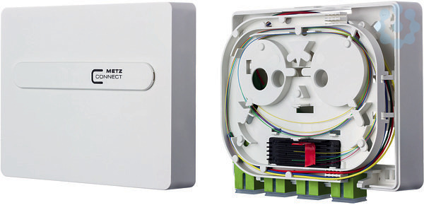 Kompakte, universelle Glasfaser-Anschlusseinheit zur Montage an Unterputz- oder Hohlwanddosen, für die Aufputz- oder Tragschienenmontage, Bestückt mit Kupplungen und Multimode-Pigtails zum Anspleißen an Mini-Breakout Kabel mit Multimodefasern, Pigtails mit Kompaktader ø 0,9 mm, Farbcode nach IEC60304, Sekundär- und Primärcoating gleichgefärbt, Pigtails gereinigt und in Kupplungen eingesteckt, Nicht belegte Ausbrüche mit Blindstopfen verschlossen, Kabeleingangsmöglichkeiten: hinten, oben, unten, links oder rechts, Mit integrierten Clips für Tragschienenmontage in zwei Richtungen, Schwenkbare abnehmbare Spleißkassette für bis zu 8 Crimpspleißschutze, Deckel werkzeuglos abnehmbar, Steckrichtung 90°, Farbe der Abdeckteile reinweiß RAL 9010, Varianten: bestückt mit SC-S oder LC-D Kupplungen und Pigtails in OM3, OM4 oder OM5