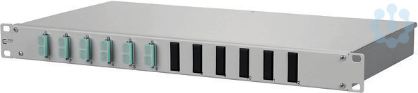 19 Zoll, 1HE LWL-Patchfeld für Festeinbau, leichte Aluminium-Konstruktion mit Stahlblech Frontplatte in RAL7035, bestückt mit SC-D Kupplungen, nicht belegte Ausbrüche mit Blindstopfen verschlossen, abnehmbare Frontplatte zur einfachen Kupplungsmontage, servicefreundliche, verschraubte Abdeckung, Einbautiefe 240 mm (ohne Verschraubung und ohne Kupplungen), mehrere Kabeleingangsmöglichkeiten rückseitig (Befestigung mit PG13,5, PG16 und PG21 bzw. M20 und M25), Kompaktader ø 0,9 mm, 12 Farben, Sekundär- und Primärcoating gleichgefärbt, Länge 2,0 m, Pigtails in Standardspleißkassette mit Crimpspleißhaltern eingelegt und abgesetzt, Pigtails gereinigt und in Kupplungen eingesteckt, Varianten: bestückt mit 6 oder 12 SC-D Kupplungen und Pigtails aqua (OM3)