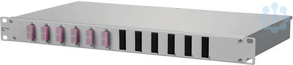 19 Zoll, 1HE LWL-Patchfeld für Festeinbau, leichte Aluminium-Konstruktion mit Stahlblech Frontplatte in RAL7035, bestückt mit SC-D Kupplungen, nicht belegte Ausbrüche mit Blindstopfen verschlossen, abnehmbare Frontplatte zur einfachen Kupplungsmontage, servicefreundliche, verschraubte Abdeckung, Einbautiefe 240 mm (ohne Verschraubung und ohne Kupplungen), mehrere Kabeleingangsmöglichkeiten rückseitig (Befestigung mit PG13,5, PG16 und PG21 bzw. M20 und M25), Kompaktader Ø 0,9 mm, 12 Farben, Sekundär- und Primärcoating gleichgefärbt, Länge 2,0 m, Pigtails in Standardspleißkassette mit Crimpspleißhaltern eingelegt und abgesetzt, Pigtails gereinigt und in Kupplungen eingesteckt, Varianten: bestückt mit 6 oder 12 SC-D Kupplungen und Pigtails erikaviolett (OM4)