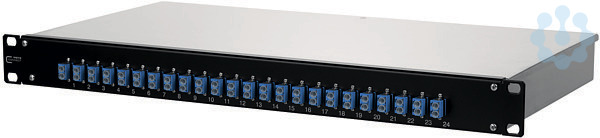 19 Zoll, 1HE LWL-Patchfeld für Festeinbau, leichte Aluminium-Konstruktion mit Stahlblech Frontplatte in RAL9005, bestückt mit LC-D Kupplungen, nicht belegte Ausbrüche mit Blindstopfen verschlossen, abnehmbare Frontplatte zur einfachen Kupplungsmontage, servicefreundliche, verschraubte Abdeckung, mehrere Kabeleingangsmöglichkeiten rückseitig (Befestigung mit PG13,5, PG16 und PG21 bzw. M20 und M25), werkzeuglose Befestigung von vorkonfektionierten Installationskabeln (OpDAT VIK) in einem U-Ausschnitt, Varianten: bestückt mit 12 oder 24 LC-D Kupplungen jeweils blau (OS2)
