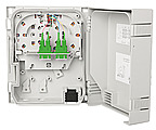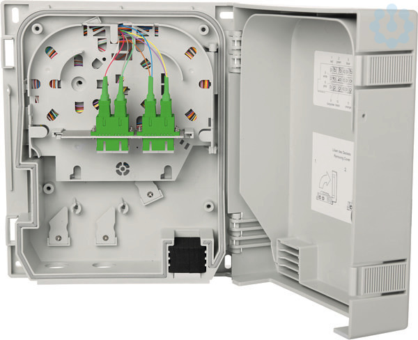 Glasfaser Spleiß-/Verteilgehäuse zum Einsatz als Hausübergabepunkt , bestückt mit SC-D Kupplungen und SC-Pigtails, Deckelverriegelung mittels Rasthaken mit Möglichkeit zur Plombierung., Deckel kann zur Erleichterung der Montage sehr einfach demontiert werden, Spleißkassette zur einfachen Montage und Wartung bei größtmöglichem Schutz der Fasern mit Auskreuzungsmöglichkeit und Faserüberlängenablage, mit oder ohne Schloss erhältlich, Zugentlastung für Kabel und Patchkabel, Montagemöglichkeit und Fixierung für Gas-/Wasserblocker vorhanden, Patchkabelausgang mit flexibler Lamellendichtung, zwei Kabeleinführungen für M20/25, eine M20-Verschraubung beiliegend, Befestigungsmöglichkeit für optische Koppler, strukturiertes ASA (Acrylester-Styrol-Acrylnitril) in RAL 7035, extrem widerstandsfähiger Kunststoff, schlagzäh und witterungsbeständig, Schutzklasse nach IEC 60529: IP 54, Varianten: bestückt mit bis zu 6 SC-D Kupplungen und bis zu 12 SC-Pigtails, jeweils blau (OS2) oder SC-D APC Kupplungen, jeweils grün (OS2)