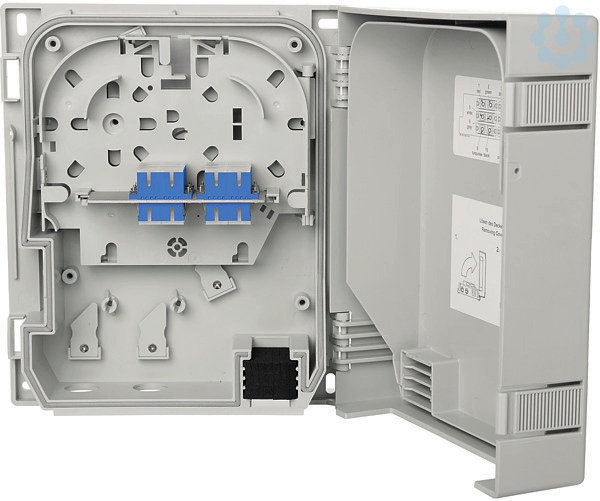 Glasfaser Spleiß-/Verteilgehäuse zum Einsatz als Hausübergabepunkt , bestückt mit SC-D Kupplungen , Aufnahmemöglichkeit für max. 12 Pigtails oder 2 VIKs, Deckelverriegelung mittels Rasthaken mit Möglichkeit zur Plombierung., Deckel kann zur Erleichterung der Montage sehr einfach demontiert werden, Spleißkassette zur einfachen Montage und Wartung bei größtmöglichem Schutz der Fasern mit Auskreuzungsmöglichkeit und Faserüberlängenablage, mit oder ohne Schloss erhältlich, Zugentlastung für Kabel und Patchkabel, Montagemöglichkeit und Fixierung für Gas-/Wasserblocker vorhanden, Patchkabelausgang mit flexibler Lamellendichtung, zwei Kabeleinführungen für M20/25, eine M20-Verschraubung beiliegend, Befestigungsmöglichkeit für optische Koppler, strukturiertes ASA (Acrylester-Styrol-Acrylnitril) in RAL 7035, extrem widerstandsfähiger Kunststoff, schlagzäh und witterungsbeständig, Schutzklasse nach IEC 60529: IP 54 , Varianten: bestückt mit bis zu 6 SC-D Kupplungen, jeweils blau (OS2) oder SC-D APC Kupplungen, jeweils