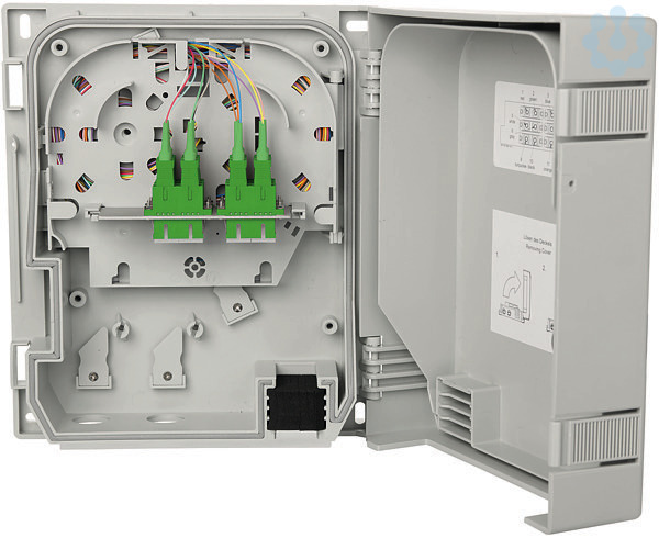 Glasfaser Spleiß-/Verteilgehäuse zum Einsatz als Hausübergabepunkt , bestückt mit SC-D Kupplungen und SC-Pigtails, Deckelverriegelung mittels Rasthaken mit Möglichkeit zur Plombierung., Deckel kann zur Erleichterung der Montage sehr einfach demontiert werden, Spleißkassette zur einfachen Montage und Wartung bei größtmöglichem Schutz der Fasern mit Auskreuzungsmöglichkeit und Faserüberlängenablage, mit oder ohne Schloss erhältlich, Zugentlastung für Kabel und Patchkabel, Montagemöglichkeit und Fixierung für Gas-/Wasserblocker vorhanden, Patchkabelausgang mit flexibler Lamellendichtung, zwei Kabeleinführungen für M20/25, eine M20-Verschraubung beiliegend, Befestigungsmöglichkeit für optische Koppler, strukturiertes ASA (Acrylester-Styrol-Acrylnitril) in RAL 7035, extrem widerstandsfähiger Kunststoff, schlagzäh und witterungsbeständig, Schutzklasse nach IEC 60529: IP 54, Varianten: bestückt mit bis zu 6 SC-D Kupplungen und bis zu 12 SC-Pigtails, jeweils blau (OS2) oder SC-D APC Kupplungen, jeweils grün (OS2)