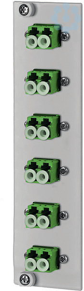 Frontplatte 3HE/7TE mit LC-D Kupplungen, Führungshülse aus Keramik geschlitzt für Singlemode und Multimode Anwendungen, geeignet für den Einbau in OpDAT REGpro und OpDAT REG S, Stahlblech pulverbeschichtet, grau, Varianten: bestückt mit LC-D-Kupplungen jeweils blau (OS2), lindgrün (OM5), violett (OM4), aqua (OM3), beige (OM2) oder grün (OS2 APC)