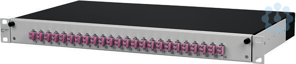 19 Zoll, 1HE LWL-Patchfeld mit ausziehbarer Spleißablage/Frontblende in RAL 7035, Auszug zur besseren Montage abkipp- und komplett herausnehbar (Auszugsstop), bestückt mit ST Kupplungen, nicht belegte Ausbrüche mit Blindstopfen verschlossen, mehrere Kabeleingangsmöglichkeiten rückseitig (Befestigung mit PG13,5, PG16 und PG21 bzw. M20 und M25) , Varianten: bestückt mit 6, 12 oder 24 ST Kupplungen metallisch (MM)