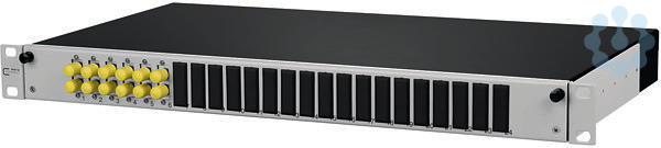 19 Zoll, 1HE LWL-Patchfeld ausziehbarer Spleißablage/Frontblende (grau oder schwarz), bestückt mit ST-D-Kupplungen und ST-Pigtails, Pigtails mit Kompaktader ø 0,9 mm, 12 Farben, Sekundär- und Primärcoating gleichgefärbt, Länge 2,0 m, Pigtails in Standardspleißkassette mit Crimpspleißhaltern eingelegt und abgesetzt, Pigtails gereinigt und in Kupplungen eingesteckt, Auszug zur besseren Montage abkipp- und komplett herausnehmbar(Auszugsstop), nicht belegte Ausbrüche mit Blindstopfen verschlossen, mehrere Kabeleingangsmöglichkeiten rückseitig (Befestigung mit PG13,5, PG16 und PG21 bzw. M20 und M25), eine Kabeleinführung PG16 ist beigelegt, Varianten: bestückt mit 6, 12 oder 24 ST-D Kupplungen und Pigtails jeweils metallisch (OS2, OM4 oder OM3)