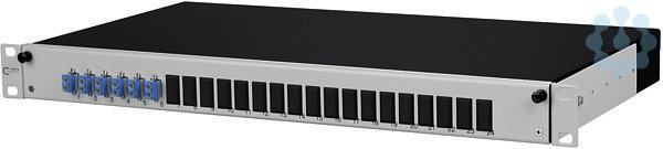 19 Zoll, 1HE LWL-Patchfeld mit ausziehbarer Spleißablage/Frontblende in RAL 7035, Auszug lässt sich zur besseren Montage abkippen und komplett herausnehmen (Auszugsstop), bestückt mit LC-D Kupplungen, nicht belegte Ausbrüche mit Blindstopfen verschlossen, mehrere Kabeleingangsmöglichkeiten rückseitig (Befestigung mit PG13,5, PG16 und PG21 bzw. M20 und M25) , Varianten: bestückt mit 6, 12 oder 24 LC-D Kupplungen jeweils blau (OS2), lindgrün (OM5), violett (OM4) oder aqua (OM3) oder mit 6, 12 oder 24 LC-D APC Kupplungen jeweils grün (OS2)