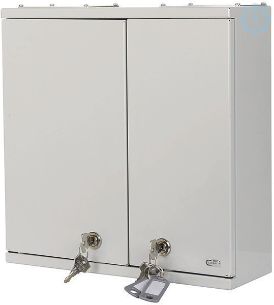 Universell einsetzbarer Verteiler zum Einsatz in der Etagenverkabelung oder als Hausverteilpunkt im Technikraum, bestückt mit LC-D-Kupplungen, nicht belegte Ausbrüche mit Blindstopfen verschlossen, Aufputzgehäuse mit zwei abschließbaren Schwenktüren und zwei verschiedenen Schlössern für die Trennung zwischen Netz- und Gebäudeverkabelung, einfache, platzsparende Wandmontage, gute Zugriffsmöglichkeiten und eine sichere Führung der VIKs, vier Kabeleinführungen (Lieferumfang): 1x für VIKs mit Universalkabel, 1x für M20/PG16, 2x für Patchkabel, Varianten: Größe S: 305x300x107 mm oder Größe M: 405x400x107 mm, Varianten: bestückt mit bis zu 48 LC-D Kupplungen, jeweils blau (OS2), lindgrün (OM5), violett (OM4), aqua (OM3) oder LC-D APC Kupplungen grün (OS2)