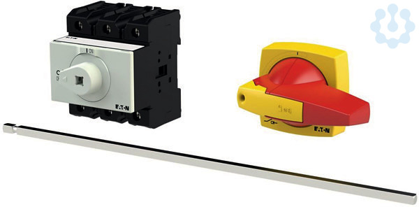 Hauptschalter, Sortiment: Hauptschalter, Wartungsschalter, Typkenner: P3, Stopp-Funktion: NOT-AUS-Funktion, mit rotem Drehgriff und gelbem Sperrkranz, Hinweise: mit Metallwelle für eine Schaltpulttiefe von 400 mm, Information zum Lieferumfang: Hilfskontakt oder Neutralleiter kundenseitig montiert., 3-polig, Verriegelungsvorrichtung: In der Position 0 (Aus) verriegelbar, Schutzart: Front IP65, Bauform: rückseitiger Einbau, Bemessungsbetriebsleistung AC-23A, 50 - 60 Hz 400 V: P = 55 kW, Bemessungsdauerstrom: Iu = 100 A, Normen und Bestimmungen: IEC/EN 60947, VDE 0660, IEC/EN 60204