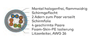 Diese von einem neutralem Labor geprüften Rangierkabel haben vergoldete Steckerkontakte, einen angespritzten Knick- und Rastnasenschutz sowie eine integrierte Zugentlastung. Der sehr kleine Kopplungswiderstand trägt zu den hervorragenden Übertragungseigenschaften bei. Alle angebotenen Patchkabel sind halogenfrei nach IEC 60754-2, flammwidrig nach IEC 60332-1 und entsprechen den jeweiligen Spezifikationen nach ISO/IEC 11801, EN 50173 und IEC 61935-2. Der RJ45-Stecker gemäß ISO/IEC 60603-7-5 ist vollbelegt (1:1) und damit anwendungsneutral. Einsetzbar für Ethernetanwendungen 10/100/1000 und 10 G-Base T. Diese Patchkabel sind geeignet für PoE/PoE+.