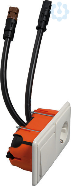Bestehend aus: Kombi-Rahmen, 2fach, Universalschalter (Aus-/Wechselschalter), 10 A 250 V~, mit braunem Kodierstecker S, Steckdose SCHUKO® 2-polig, 16 A 250 V, mit schwarzem Kodierstecker A, mit erhöhtem Berührungsschutz, für die Montage in Hohlwänden, inkl. luft-dichter Einbaudose, mit vorkonfektionierter Kabelpeitsche, Kabel länge 30 cm