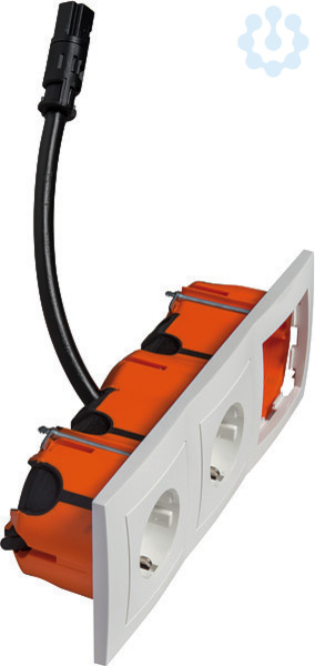 Bestehend aus: Kombi-Rahmen, 3fach, Doppel-Steckdose SCHUKO® 2-polig, 16 A 250 V, mit schwarzem Kodierstecker A, mit erhöhtem Be- rührungsschutz sowie einem leeren Steckplatz zur individuellen Nutzung, inkl. luftdichter Einbaudose, mit vorkonfektionierter Kabelpeitsche, Kabel länge 30 cm