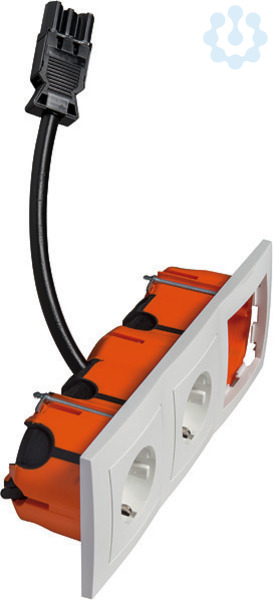 Bestehend aus: Kombi-Rahmen, 3fach, Doppel-Steckdose SCHUKO® 2-polig, 16 A 250 V, mit schwarzem Kodierstecker A, mit erhöhtem Be- rührungsschutz sowie einem leeren Steckplatz zur individuellen Nutzung, inkl. luftdichter Einbaudose, mit vorkonfektionierter Kabelpeitsche, Kabel länge 30 cm