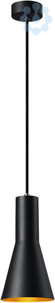 Die konisch geformte Hochvolt Pendelleuchten Serie PHELIA bietet eine Vielfalt von Variationen. Die in schwarz/gold gehaltene Leuchte verfügt über eine runde Deckenrosette. Durch den verbauten E27 Sockel ist die Leuchte für LED- und Energiesparleuchtmittel geeignet. Die Pendellänge der Leuchte beträgt 200 cm.