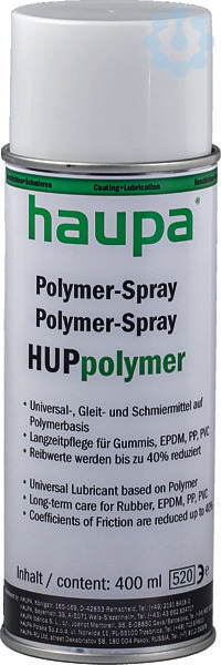 Polymer-Spray HUPpolymerAnwendung HUPpolymer: Ersatz für Silikonspray als Einzieh-, Gleit- und Schmierhilfe, wie auch als Langzeitpflege für Gummis, EPDM, PP, PVC etc. Deutlich verbesserte Gleiteigenschaften auf beschichteten Oberflächen - die Reibwerte werden bis zu 40% reduziert. Behandelte Oberflächen weisen ein farbvertiefendes Aussehen auf. Beschichtete Oberflächen sind wasserabweisend, unempfindlicher gegenüber Verschmutzung. Problemlose Weiterverarbeitung (Verkleben, Lackieren, Bedrucken etc.) von angrenzenden Materialien. Eigenschaften: HUPpolymer für Kontaminierungen von Werkzeug und gefertigten Teilen, die beim Einsatz von Silikonölen auftreten können, werden vermieden. Keine Bildung von Spannungsrissen bei Kontakt behandelter Profile mit Plexiglas oder Polycarbonat.? Universal-, Gleit- und Schmiermittel auf Polymerbasis ? Langzeitpflege für Gummis, EPDM, PP, PVC ? Reibwerte werden bis zu 40% reduziert
