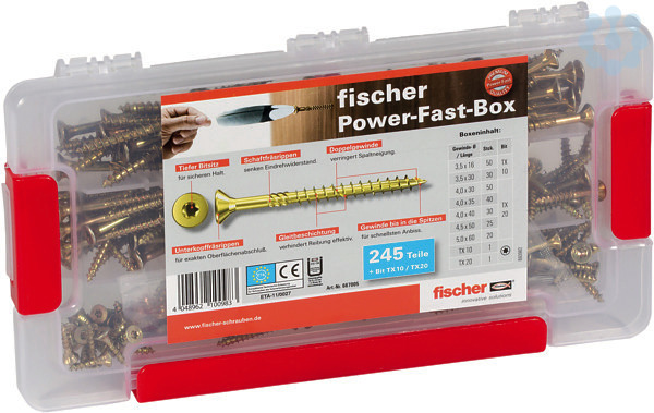 Die fischer Power-Fast Sortimentsbox FAB FPF-ST YZ 245 P beinhaltet 245 Power-Fast Schrauben von Ø 3,5 bis Ø 5, 1 bit TX 10, 1 Bit TX 20. Das einzigartige Power-Fast Gewinde reicht bis in die Schraubenspitze und sorgt für einen schnellen Anbiss. Dies erleichtert die Verarbeitung in allen Holzbaustoffen spürbar. Die optimierte Kopfgeometrie ermöglicht auch bei randnahen Verschraubungen einen exakten und splitterfreien Oberflächenabschluss ohne Abreißen der Schraube. Die fischer Power-Fast Schrauben sind geeignet für die Befestigung von beispielsweise Sockelleisten, Tür- und Metallbeschlägen, allgemeinen Holzverbindungen sowie für zulassungsrelevanten Anwendungen.