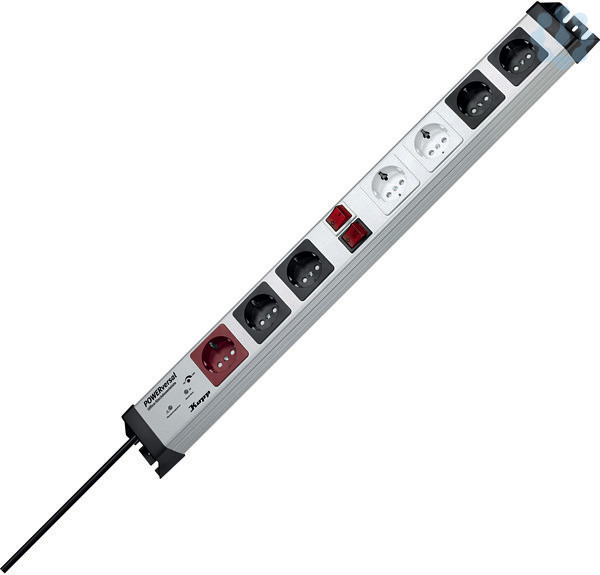 POWERversal 1+2+2x2-fach, Master Slave Funktion, mit Geräteschutz- Überspannungsfilter SAFETRONIC, max.3600W, IP20, mit zwei 2-poligen beleuchteten Schaltern, 1x Master und 2 Slave-Steckdosen, sowie zusätzlich 4 Steckdosen die in Gruppen mit Schalter geschaltet werden, mit einstellbarer Schaltschwelle von 7-70W, optische und akustische Ausfallanzeige nach Überspannungsschaden, mit erhöhtem Berührungsschutz, mit 90° gedrehten Töpfen, 65mm Topfabstand,anschraubbar, wiederanschließbar, Zuleitung H05VV-F3Gx1,5mm², 1,4m, Maße(lxbxh): (677,6x71x58,3)mm, 16A, 250V~, silber-schwarz
