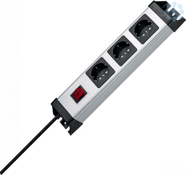 POWERversal 3-fach, 250V~, 16A, max.3600W, IP20, mit 2-poligem beleuchteten Schalter,mit erhöhtem Berührungsschutz, mit 90° gedrehten Töpfen, 65mm Topfabstand, anschraubbar, wiederanschließbar, Zuleitung H05VV-F3G1,5mm², 1,4m, Maße (lxbxh):(352,6x71x58,3)mm, silber-schwarz