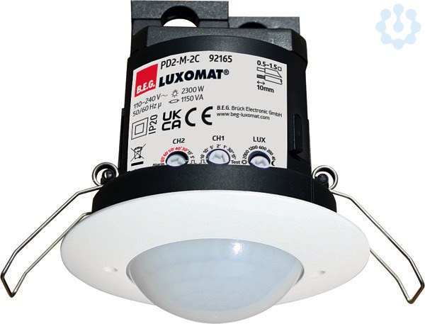 Präsenzmelder mit kreisförmigem Erfassungsbereich, Ein Kanal zum Schalten von Licht, Ein zusätzlicher potentialfreier Kontakt für HKL, Ausführung als Master-Gerät, Erweiterung des Erfassungsbereiches mit Slave-Geräten möglich, Manuelles Schalten über Taster möglich, Alarmimpuls: Auslösen erst bei drei erkannten Bewegungen innerhalb von 9 Sekunden, Weitere Funktionen über optionale Fernbedienung einstellbar, Werkseinstellung 10 min und 500 Lux (15 min HKL), Schaltung im Nulldurchgang