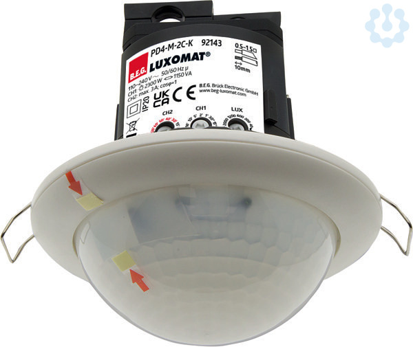 Präsenzmelder speziell für Korridore, Ein Kanal zum Schalten von Licht, Ein zusätzlicher potentialfreier Kontakt für HKL, Ausführung als Master-Gerät, Erweiterung des Erfassungsbereiches mit Slave-Geräten möglich, Manuelles Schalten über Taster möglich, Alarmimpuls: Auslösen erst bei drei erkannten Bewegungen innerhalb von 9 Sekunden, Weitere Funktionen über optionale Fernbedienung einstellbar, Für die Ausrichtung des Melders sind Markierungen vorhanden, Werkseinstellung 10 min und 500 Lux (15 min HKL)
