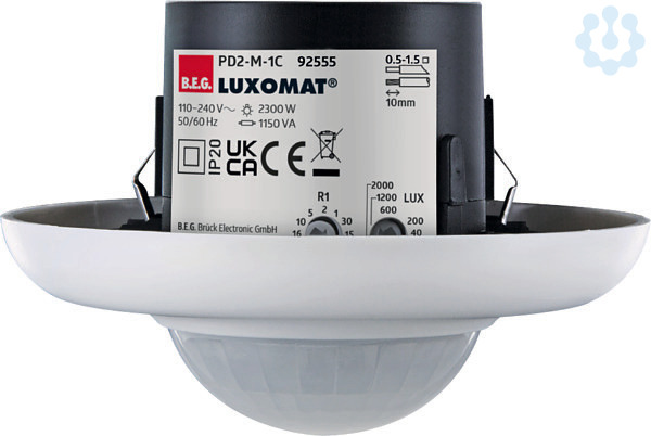 Präsenzmelder mit einem potentialfreien Kontakt, Ausführung als Master-Gerät, Ein Kanal zum Schalten von Licht, Erweiterung des Erfassungsbereiches mit Slave-Geräten möglich, Manuelles Schalten über Taster möglich, Weitere Funktionen über optionale Fernbedienung einstellbar, Werkseinstellung 10 min und 500 Lux