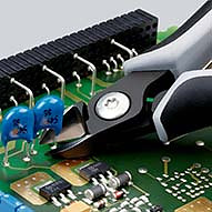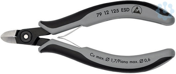 79 12 125 ESD Präzisions-Elektronik-Seitenschneider ESD Griffe elektrisch ableitend ? dissipativ. Präzisionszangen für feinste Schneidarbeiten, z. B. in Elektronik und Feinmechanik. Sehr genau geschliffene, scharfe Schneiden mit sehr kleinen Facetten für exakte Schnitte an empfindlichen Elektronik-Bauteilen. auch ohne Facette für bündiges Schneiden. Präzisions-Schneiden zusätzlich induktiv gehärtet, Schneidenhärte ca. 64 HRC. Ca. 20 % weniger Gewicht als konventionelle Elektronikzangen. Geschraubtes Gelenk mit besonders sorgfältig gefertigten Gelenkflächen für gleichmäßige, reibungsarme Bewegung im gesamten Öffnungsbereich. Leichtgängige Doppelfeder für ein sanftes und gleichmäßiges Öffnen. Ergonomisch optimierte Mehrkomponenten-Hüllen. speziell zum Trennen von hartem Draht sowie Pianodraht. - Schneidwerte mittelharter Draht (Durchmesser): Ø 1,3mm - Schneidwerte harter Draht (Durchmesser): Ø 1,0mm - Schneidwerte Pianodraht (Durchmesser): Ø 0,6mm - Schneidwerte weicher Draht (Durchmesser): Ø 0,3???1,7mm - Back