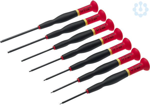 Elektronik-Stiftschlüssel-Sortiment (Innensechskant) 7teilig für Innen-Sechskantschrauben Die optimalen Werkzeuge speziell für kleinste Schrauben bei elektronischen und elektrischen Bauteilen, Radio- und Stereoanlagen, Telefonanlagen und allen Kommunikationsanschlüssen, für Feinmechanik, Elektronik, ModellBau und ähnliche feinsensorische Arbeiten, Klingen aus Spezialstahl, Farbcodierungsring zur Kennzeichnung des Schraubsystems, für Innen-Sechskantschrauben, SW 0, 7 x 40 140 11 1910, SW 0, 9 x 40 140 11 1911, SW 1, 3 x 40 140 11 1912, SW 1, 5 x 50 150 11 1913, SW 2, 0 x 50 150 11 1914, SW 2, 5 x 60 160 11 1915, SW 3, 0 x 60 160