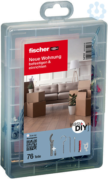 Die fischer Praktische Helfer Box Umziehen & Einziehen enthält vorsortiert 15 DUOPOWER 5 x 25 und 10 Senkkopfschrauben 3,5 x 35, 3 Winkelhaken 3,5 und 2 Rundhaken 3,5, 20 DUOPOWER 6 x 30 und 12 Senkkopfschrauben 4,5 x 40, 4 Winkelhaken 4,5 und 4 Rundhaken 4,5, 4 Bildhaken Fast & Fix in weiß, 1 Bit PZ 2 und 1 Flaschenöffner SX. Die aus hochwertigem und schlagfestem Kunststoff gefertigte Box ist ideal für alle Befestigungslösungen rund ums Umziehen und Einziehen. Der transparente Deckel ermöglicht die Übersicht auf einen Blick. Die Praktische Helfer Box verschließt sich fest und kann wieder mit Dübeln befüllt werden.