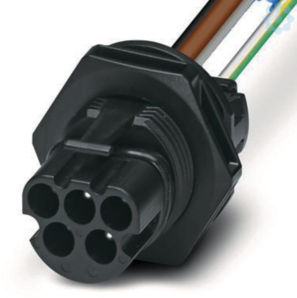 Rundsteckverbinder (geräteseitig), Artikelfamilie: PRC, Gerätesteckverbinder Hinterwand, Material Gehäuse: PPE, Farbe: schwarz, Polzahl: 5, Aderquerschnitt max.: 6 mm², Nennspannung: 690 V AC, Bemessungsstrom: 35 A, Anschlussart: Crimpanschluss, Kontaktart: Stift, Kabellänge: 150