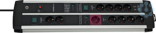 Die Premium-Protect-Line 11er Highend-Steckdosenleiste von Brennenstuhl in der Farbe schwarz und 3m Kabel besticht durch ihre Qualität und Sicherheit in allen Bereichen. Die Gaming-Steckdosenleiste verfügt über ein praktisches Automatik-Schaltsystem. Das Master-Gerät (z.B. einen Computer) kann die Slave-Geräte (z.B. Monitor, Soundsystem, Drucker, Scanner usw.) in die automatische Steuerung mit einbeziehen. Mit dem Ein/Aus Schalter des Gerätes (in roten Master-Steckdose eingesteckt) können alle Geräte (in den Slave-Steckdosen) automatisch mit ein und ausgeschaltet werden. Die Gaming-Mehrfachsteckdose verfügt nicht nur über einen erhöhten Berührungsschutz, sondern überzeugt außerdem durch folgende Eigenschaften:
