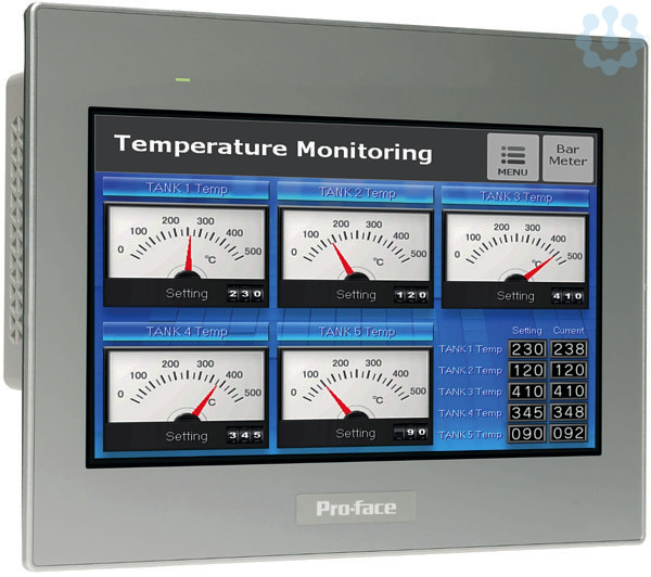 Pro-face ST6000E Basic Touch-Panel für einfache Maschinen, programmiert mit der Software GP-Pro EX. Diese Produkt-Reihe wurde entwickelt, um die Anforderungen an die Bedienerschnittstelle einfacher Maschinen zu erfüllen. Hierbei steht die Kompatibilität der Software auf einer modernen Hardware im Mittelpunkt. Das resistive Single-Touch Display in 10 Zoll wide screen mit 16 Mio Farben und einer Auflösung von 1024x600 Pixel dient der Visualisierung, Bedienung und Statusanzeige ihrer Anwendungen. Die Bedienoberfläche auf dem HMI wird mit der Software GP-Pro EX konfiguriert. Durch die vielfältigen Schnittstellen (2 x Ethernet (dual IP), 2 x serielle COM, 1 x USB Typ A, 1 x USB micro-B) ist eine optimale Konnektivität gewährleistet. Die äußeren Abmessungen des Displays betragen 273 mm (Breite) x 203 mm (Höhe) x 47 mm (Tiefe) bei einem Panel Cut-out von 255 mm x 185 mm und einer Tafeldicke von 1,6 bis 5 mm. Das Produkt entspricht der Schutzklasse IP65F, Typ 1, Typ 4X (nur für den Innenbereich), Typ 12 und Typ 13 (b