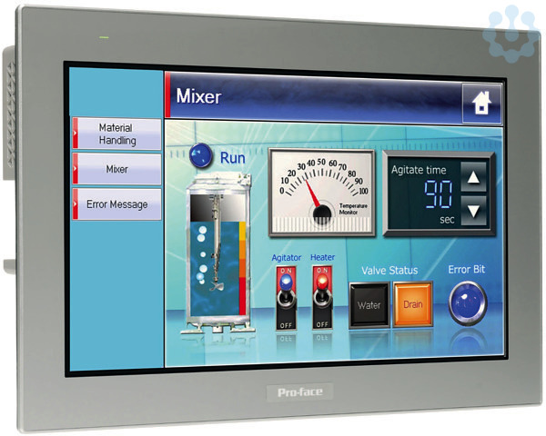 Pro-face ST6000E Basic Touch-Panel für einfache Maschinen, programmiert mit der Software GP-Pro EX. Diese Produkt-Reihe wurde entwickelt, um die Anforderungen an die Bedienerschnittstelle einfacher Maschinen zu erfüllen. Hierbei steht die Kompatibilität der Software auf einer modernen Hardware im Mittelpunkt. Das resistive Single-Touch Display in 15 Zoll wide screen mit 16 Mio Farben und einer Auflösung von 1366x786 Pixel dient der Visualisierung, Bedienung und Statusanzeige ihrer Anwendungen. Die Bedienoberfläche auf dem HMI wird mit der Software GP-Pro EX konfiguriert. Durch die vielfältigen Schnittstellen (2 x Ethernet (dual IP), 2 x serielle COM, 1 x USB Typ A, 1 x USB micro-B) ist eine optimale Konnektivität gewährleistet. Die äußeren Abmessungen des Displays betragen 412 mm (Breite) x 2268 mm (Höhe) x 50 mm (Tiefe) bei einem Panel Cut-out von 304 mm x 250 mm und einer Tafeldicke von 1,6 bis 5 mm. Das Produkt entspricht der Schutzklasse IP65F, Typ 1, Typ 4X (nur für den Innenbereich), Typ 12 und Typ 13 (