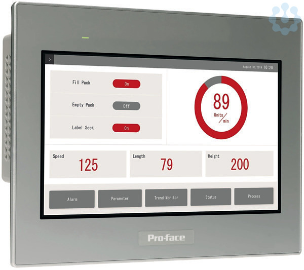 Das Basic Web-Panel STW6000 ist ein Webbrowser-basiertes Standard Touch-Panel aus der Pro-face ST6000-Reihe. Diese Produkt-Reihe wurde entwickelt, um die Anforderungen an die Bedienerschnittstelle einfacher Maschinen zu erfüllen. Hierbei stehen ein schnelles und einfaches Setup und der flexible und vielfältige Einsatz im Mittelpunkt. Das resistive Single-Touch Display in 10 Zoll wide screen mit 16 Mio Farben und einer Auflösung von 1024x600 Pixel dient der Visualisierung, Bedienung und Statusanzeige ihrer Anwendungen. Das Web Panel dient der Anzeige von Web Servern und Webvisualisierungen. Die Bedienoberfläche auf dem HMI basiert auf der CoDeSys Webvisualisierung. Durch die vielfältigen Schnittstellen (2 x Ethernet (switch Funtion für Daisy Chain), 1 x USB Typ A) ist eine optimale Konnektivität gewährleistet. Die äußeren Abmessungen des Displays betragen 273 mm (Breite) x 203 mm (Höhe) x 47 mm (Tiefe) bei einem Panel Cut-out von 255 mm x 185 mm und einer Tafeldicke von 1,6 bis 5 mm. Das Produkt entspricht der