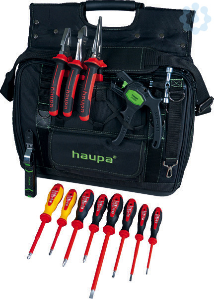 HAUPA ?ProBag Go 1000 V?Werkzeugtasche ProBag mit Einsteckfächern innen und außen, Bodenschale aus Kunststoff, doppelte Kreuznaht für hohe Belastung, abnehmbarer Schultergurt, verstellbar, 4 Außentaschen (verschiedene Größen), Halter für Isolierband, 2 große Innenfächer, passend für z.B. DIN A4 Ordner oder 15? Laptops mit diversen Einsteckfächern (verschiedene Größen), Gurte für Wasserwaage (außen), Material: extrem starkes 1680D-Polyester, wasser- und schmutzabweisend, Farbe: grün, schwarz. Tasche 220368.Inhalt: ? VDE-Kombizange 185 mm ? VDE-Kraftseitenschneider 170 m ? VDE-Storchschnabelzange gerade 200 mm ? 2K-VDE-Schraubendreher PZ/FL 1 + 2 ? 2K-VDE-Elektriker-Schraubendreher 2,5x75, 3,5x100, 4x100, 6,5x150 mm ? 2K-VDE-Schraubendreher PH 1 + 2 ? Abisolierzange 0,2-6 mm2 ? Schaltschrankschlüssel ? Abmantler Hakenklinge 8 ? 28 mm Ø