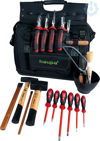 HAUPA ?ProBag Start VDE?Werkzeugtasche ProBag mit Einsteckfächern innen und außen, Bodenschale aus Kunststoff, doppelte Kreuznaht für hohe Belastung, abnehmbarer Schultergurt, verstellbar, 4 Außentaschen (verschiedene Größen), Halter für Isolierband, 2 große Innenfächer, passend für z.B. DIN A4 Ordner oder 15? Laptops mit diversen Einsteckfächern (verschiedene Größen), Gurte für Wasserwaage (außen), Material: extrem starkes 1680D-Polyester, wasser- und schmutzabweisend, Farbe: grün, schwarz. Tasche 220368.Inhalt: ? 2K-VDE-Elektriker-Schraubendreher 2,5 x 75, 4 x 100, 5,5 x 125, 6,5 x 150 mm ? 2K-VDE-Kreuzschlitz-Schraubendreher PH, Gr. 1 + 2 ? 2K-VDE-Telefonzange 200 mm ? 2K-VDE-Kombizange 180 mm ? VDE-Kraftseitenschneider 170 mm ? 2K-VDE-Abisolierzange 160 mm ? Kabelmesser, 1-teilig ? PUK-Taschensäge ? 1 Elektriker-Meißel 10 x 250 mm ? Spannungsprüfer, Klinge 50 mm ? 1 Steinmeißel 300 mm ? 1 Schlosserhammer 300 g ? 1 Fäustel 1000 g ? 1 Spachtel 40 mm ? 1 Gipsmulde ? 1 Pinsel