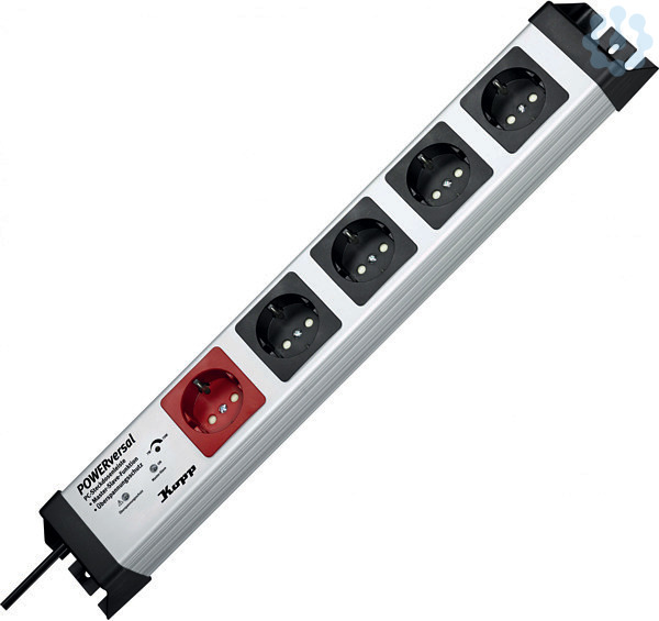 POWERversal 1+4fach, mit Master-Slave Funktion, mit Geräteschutz- Überspannungsfilter SAFETRONIC, max.3600W, IP20, optische und akustische Ausfallanzeige nach Überspannungsschaden, mit einstellbarer Schaltschwelle von 7-70W, mit erhöhtem Berührungsschutz, mit 90° gedrehten Töpfen, 65mm Topfabstand,anschraubbar, wiederanschließbar, Zuleitung H05VV-F3G1,5mm², 1,4m, Maße (lxbxh): (482,6x71x58,3)mm, 16A, 250V~, silber-schwarz