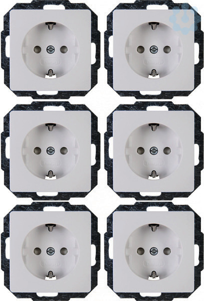 Profi-Pack: 6x Schutzkontakt-Steckdose mit erhöhtem Berührungsschutz im Design PARIS und der Farbe arktisweiß. Der Nennstrom beträgt 16A und die Nennspannung 250V~, Schutzart IP20