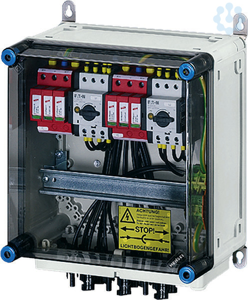 Generator-Anschlusskasten für PV-Anlagen bis 1000 V d.c. nach IEC 61439, komplett montiert und anschlussfertig verdrahtet. Die Gehäuse aus hochwertigem Thermoplast sind schutzisoliert, Schutzart IP 65. Nach Bedarf sind PV-Generator-Anschlusskästen mit Überspannungsableitern, Generatorfreischaltern und Strangsicherungen ausgestattet. Sie sind für die geschützte Installation im Freien geeignet und UV-beständig. Die Wandbefestigung erfolgt über Außenlaschen aus Edelstahl. PV-Generator-Anschlusskasten mit 2 DC-Überspannungsableitern Typ 2 und 2 DC-Generatorfreischaltern. 4 x PV-Strang auf 2 x Wechselrichter-Eingang. Die Steckanschlüsse sind kompatibel zu MC4. Deckelverschlüsse für Werkzeugbetätigung.