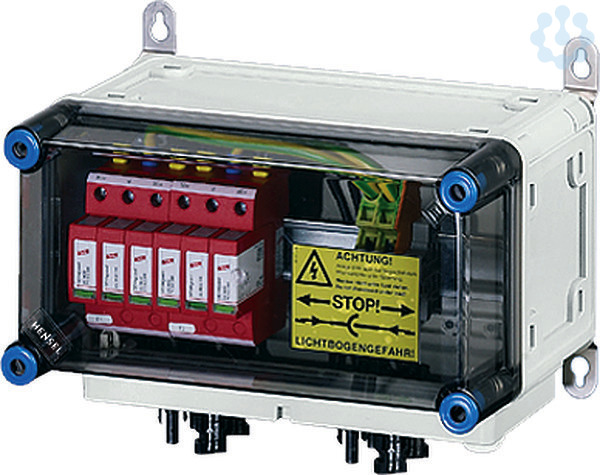 Generator-Anschlusskasten für PV-Anlagen bis 1000 V d.c. nach IEC 61439, komplett montiert und anschlussfertig verdrahtet. Die Gehäuse aus hochwertigem Thermoplast sind schutzisoliert, Schutzart IP 65. Nach Bedarf sind PV-Generator-Anschlusskästen mit Überspannungsableitern, Generatorfreischaltern und Strangsicherungen ausgestattet. Sie sind für die geschützte Installation im Freien geeignet und UV-beständig. Die Wandbefestigung erfolgt über Außenlaschen aus Edelstahl. PV-Generator-Anschlusskasten mit 2 DC-Überspannungsableitern Typ 2. 2 x PV-Strang auf 2 x Wechselrichter-Eingang. Die Steckanschlüsse sind kompatibel zu MC4. Deckelverschlüsse für Werkzeugbetätigung.
