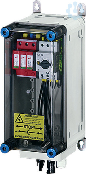 Generator-Anschlusskasten für PV-Anlagen bis 1000 V d.c. nach IEC 61439, komplett montiert und anschlussfertig verdrahtet. Die Gehäuse aus hochwertigem Thermoplast sind schutzisoliert, Schutzart IP 65. Nach Bedarf sind PV-Generator-Anschlusskästen mit Überspannungsableitern, Generatorfreischaltern und Strangsicherungen ausgestattet. Sie sind für die geschützte Installation im Freien geeignet und UV-beständig. Die Wandbefestigung erfolgt über Außenlaschen aus Edelstahl. PV-Generator-Anschlusskasten mit DC-Überspannungsableiter Typ 2 und DC-Generatorfreischalter. 2 x PV-Strang auf 1 x Wechselrichter-Eingang. Die Steckanschlüsse sind kompatibel zu MC4. Deckelverschlüsse für Werkzeugbetätigung.