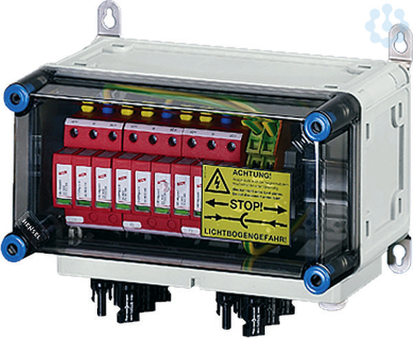 Generator-Anschlusskasten für PV-Anlagen bis 1000 V d.c. nach IEC 61439, komplett montiert und anschlussfertig verdrahtet. Die Gehäuse aus hochwertigem Thermoplast sind schutzisoliert, Schutzart IP 65. Nach Bedarf sind PV-Generator-Anschlusskästen mit Überspannungsableitern, Generatorfreischaltern und Strangsicherungen ausgestattet. Sie sind für die geschützte Installation im Freien geeignet und UV-beständig. Die Wandbefestigung erfolgt über Außenlaschen aus Edelstahl. PV-Generator-Anschlusskasten mit 3 DC-Überspannungsableitern Typ 2. 3 x PV-Strang auf 3 x Wechselrichter-Eingang. Die Steckanschlüsse sind kompatibel zu MC4. Deckelverschlüsse für Werkzeugbetätigung.
