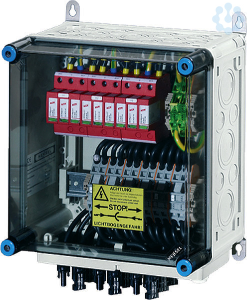 Generator-Anschlusskasten für PV-Anlagen bis 1000 V d.c. nach IEC 61439, komplett montiert und anschlussfertig verdrahtet. Die Gehäuse aus hochwertigem Thermoplast sind schutzisoliert, Schutzart IP 65. Nach Bedarf sind PV-Generator-Anschlusskästen mit Überspannungsableitern, Generatorfreischaltern und Strangsicherungen ausgestattet. Sie sind für die geschützte Installation im Freien geeignet und UV-beständig. Die Wandbefestigung erfolgt über Außenlaschen aus Edelstahl. PV-Generator-Anschlusskasten mit 3 DC-Überspannungsableitern Typ 2. 6 x PV-Strang auf 3 x Wechselrichter-Eingang. Die Steckanschlüsse sind kompatibel zu MC4. Deckelverschlüsse für Werkzeugbetätigung.