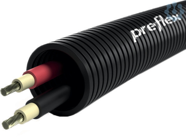 UV-stabiles und halogenfreies biegsames schwarzes Elektroinstallationsrohr in Dimension 25 mm, vorverdrahtet mit 2 x 6 mm starken DC-Kabeln in Rot und Schwarz. Geprüft nach EN 61386-22, Klassifizierung EN 3422 2, Scheiteldruckfestigkeit > 750 N, Temperaturbereich -5°C bis +90°C. Lieferform 100 m Bund. Verwendung: Ideal zur einfachen Installation von Photovoltaikanlagen.