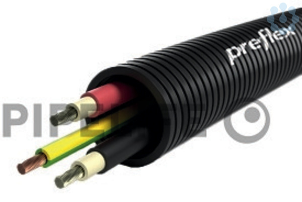 UV-stabiles und halogenfreies biegsames schwarzes Elektroinstallationsrohr in Dimension 25 mm, vorverdrahtet mit 2 x 6 mm starken DC-Kabeln in Rot und Schwarz und 1 x 6 mm PE-Kabel.