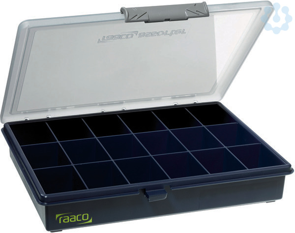 Sortimentskästen PSC preiswerte Transport- und Aufbewahrungskoffer für Kleinteile, mit fester, variabler oder ohne Inneneinteilung, aus widerstandsfähigem Polypropylen, stabile Schiebeverschlüsse mit Rastung, Kofferdeckel Deckel mit U-Profilen für verrutschsichere Aufbewahrung von Lagergut und loser Einsatzfach, stapelbar, auch hochkant aufzustellen, Farbe anthrazit - blau - transparent, PSC Fix Sortimentskästen mit fester Inneneinteilung, Typ Fix-18, Kleingefache 18, 0, 34kg, Maße 240x195x43mm