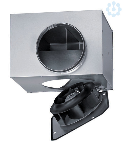 Gehäuse in längerer Bauform aus verzinktem Stahlblech mit schalldämmender, über 50 mm starker Mineralwolle-Auskleidung. Serienmäßige Lieferung saug- und druckseitig mit Anschlussstutzen und Lippendichtung für Normrohr-Durchmesser. Motor-Laufrad-Einheit ausschwenkbar zur Reinigung und Revision.